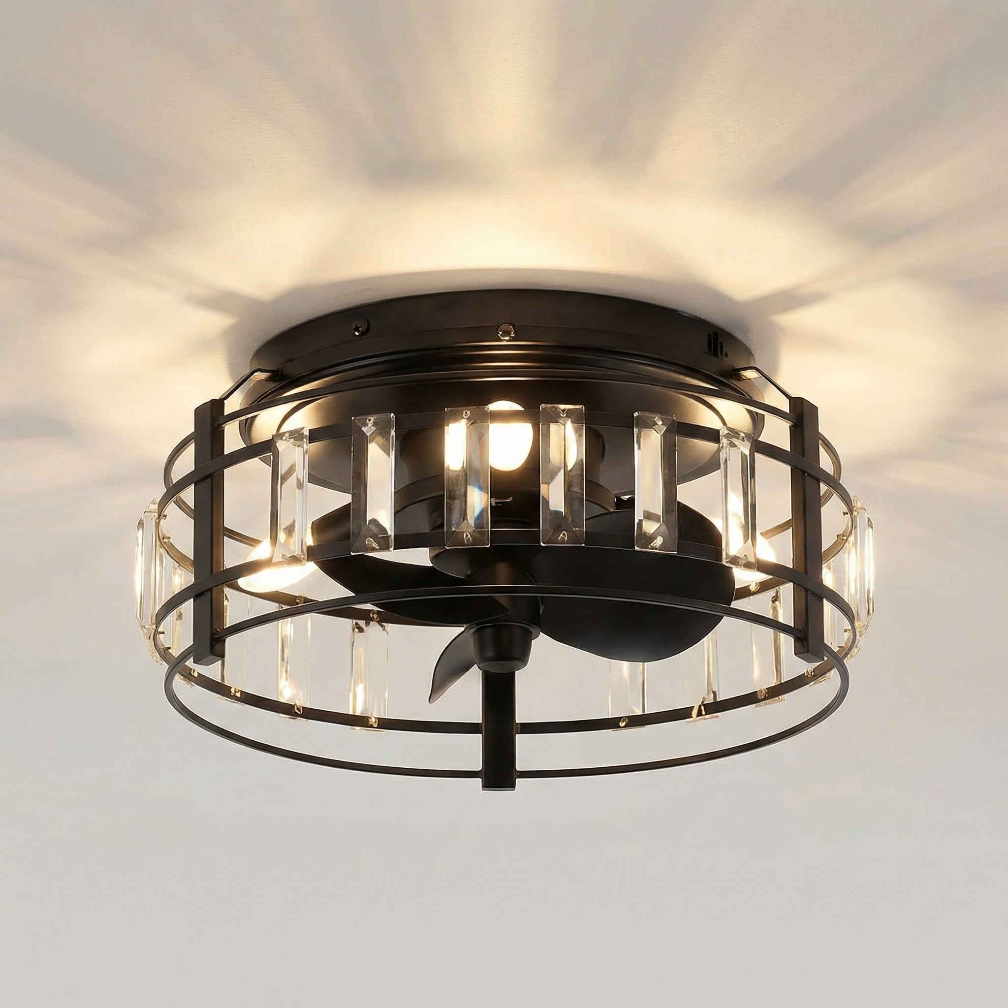 Our 13" Flush Mount Ceiling Fan Light adds vintage charm with an industrial flair, making it a perfect match for modern furniture. The crystal accents on the lampshade provide a stylish finishing touch to your home decor. Equipped with three ABS fan blades and three G9 2W bulbs (included), it meets your everyday lighting needs. Ideal for children's rooms, bedrooms, kitchen islands, or dining areas.