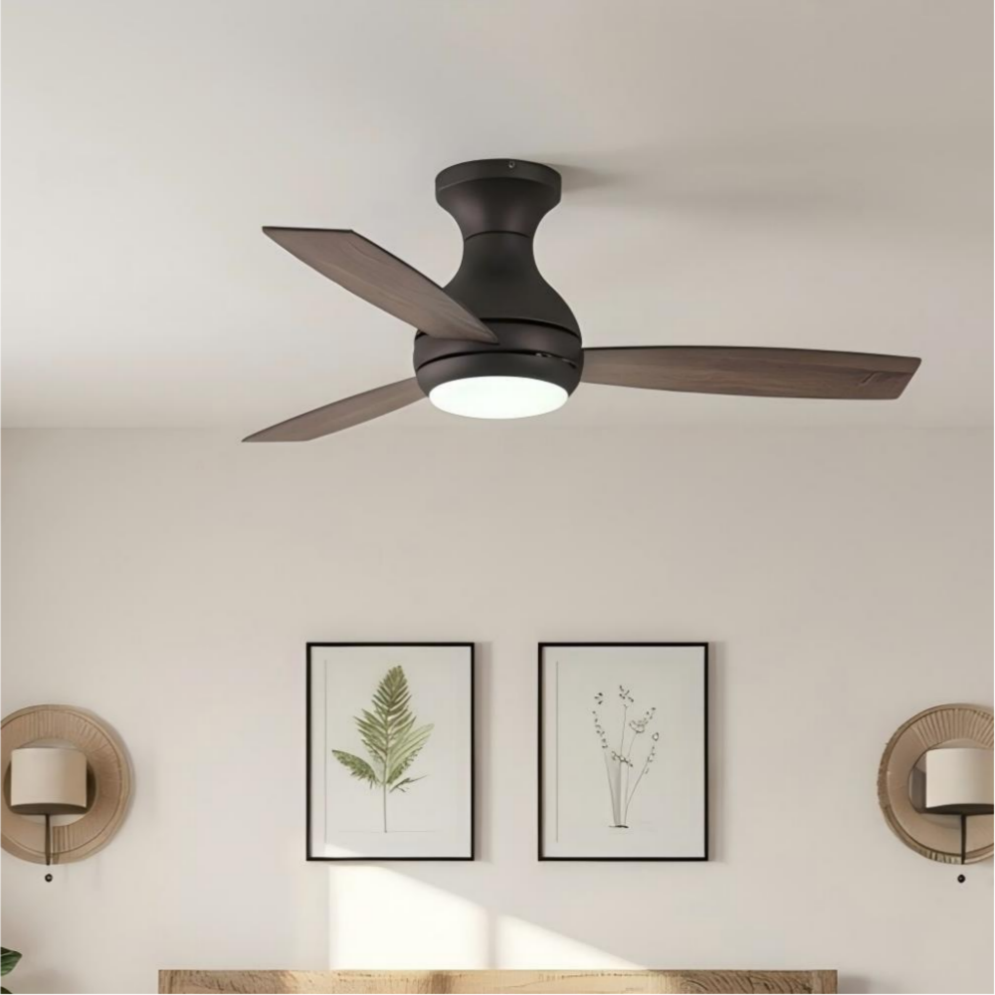 This sleek, contemporary ceiling fan features an LED light and an oil-rubbed bronze finish, offering a stylish, streamlined design that complements any modern home. The compact structure is perfect for rooms with low ceilings, measuring 48" x 48" x 14". Its low-profile housing mounts flush to the ceiling, making it an ideal choice for living rooms, bedrooms, or children's rooms.