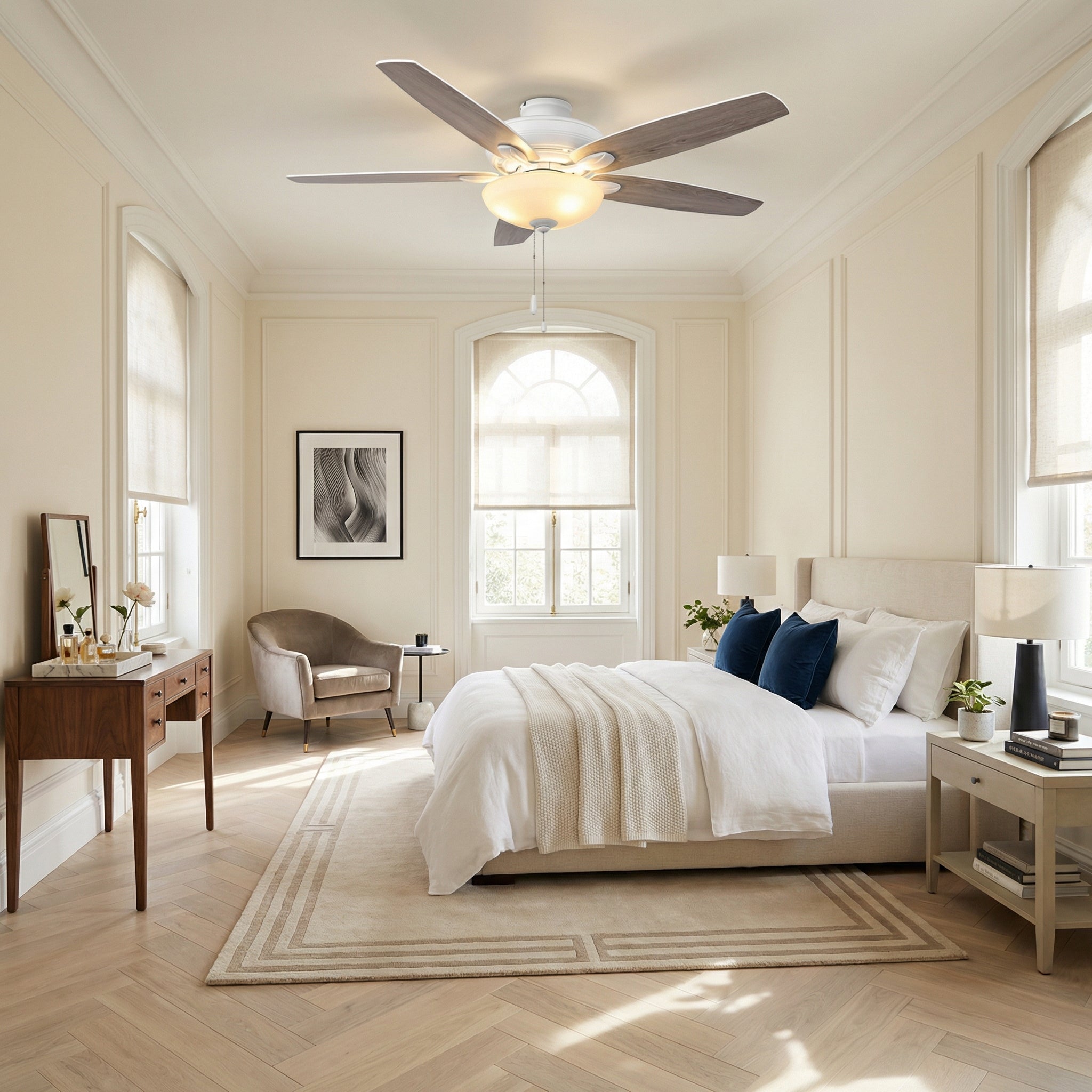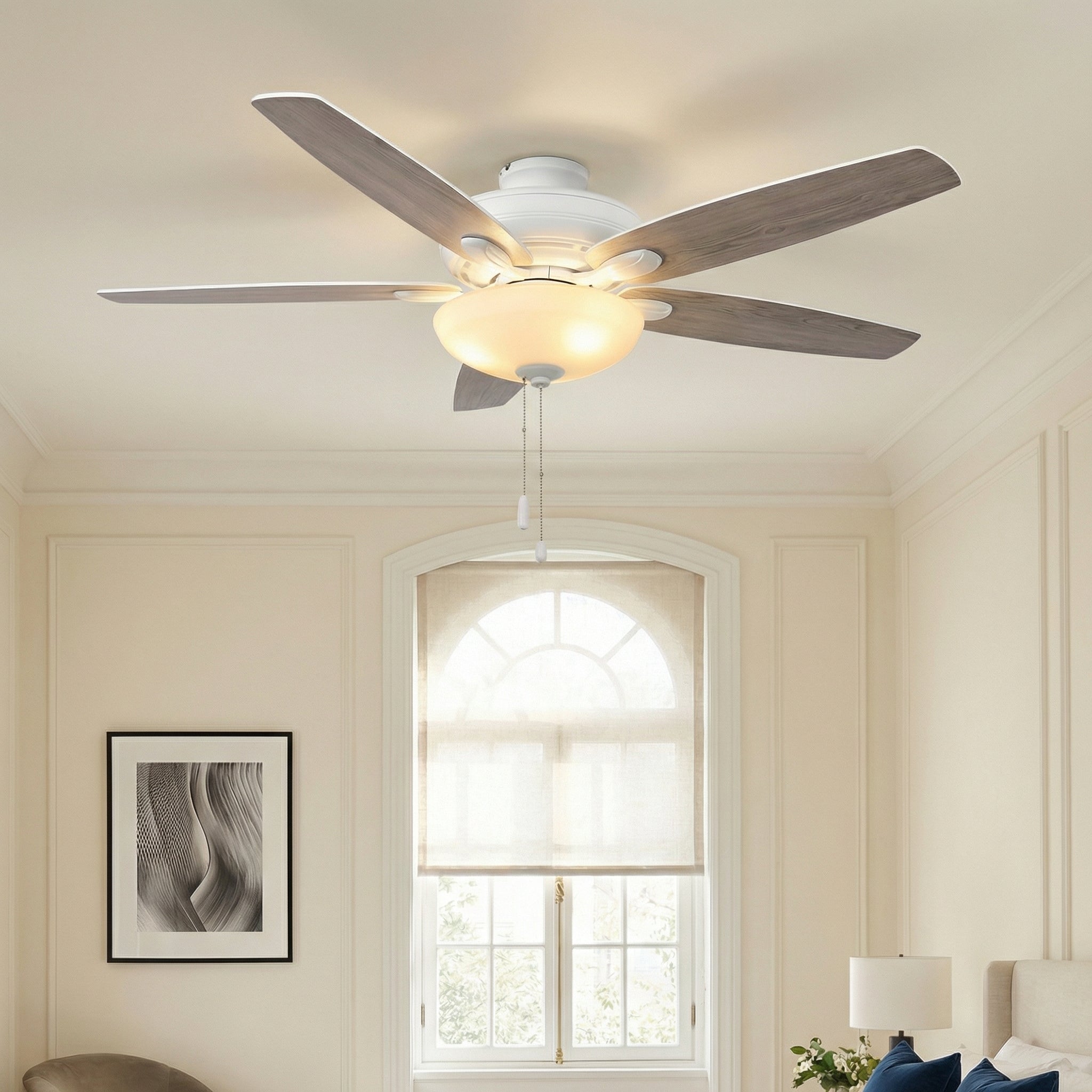 Bring style and comfort to indoor rooms or covered outdoor areas with this 52" Traditional Indoor/Outdoor Cord-Pull Ceiling Fan. Install it your way—downrod or flush mount. Its timeless, simple look features durable two-tone MDF blades to suit your décor. A 3-speed reversible motor delivers year-round use, and everyday operation is easy with the included pull chain.