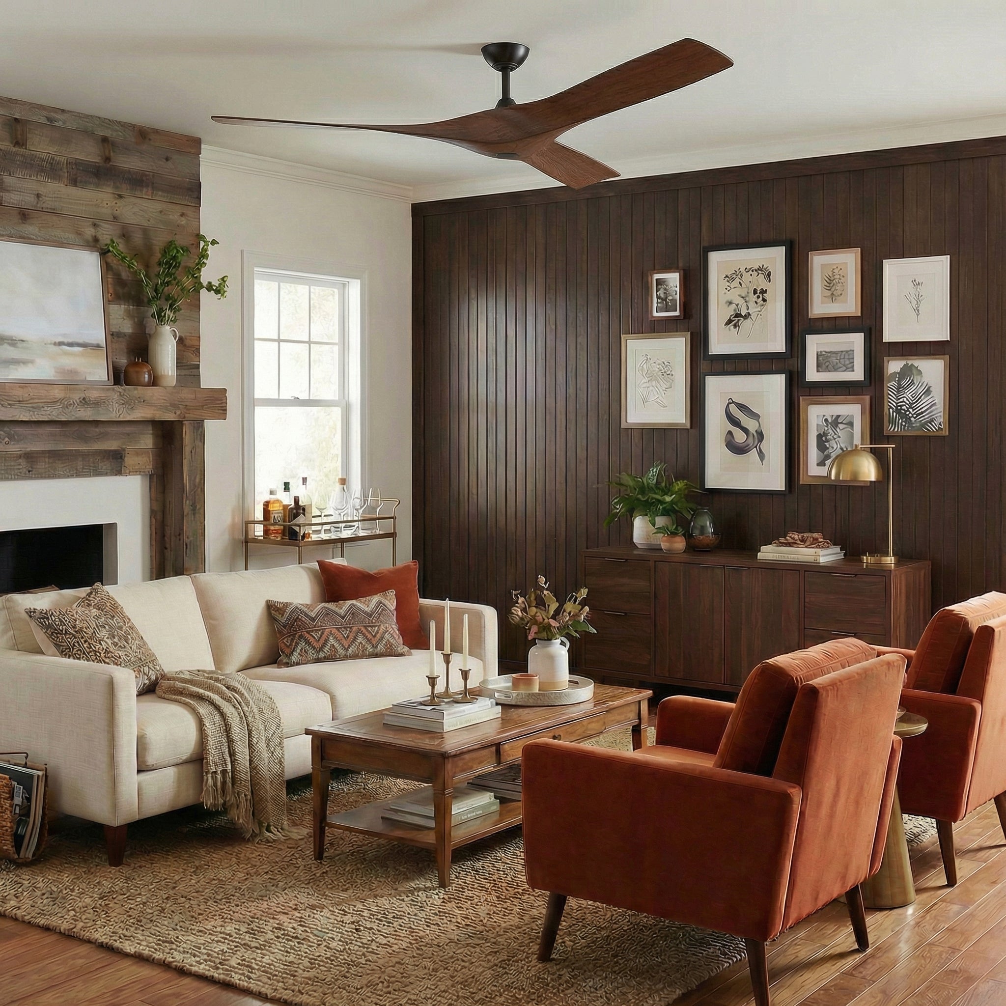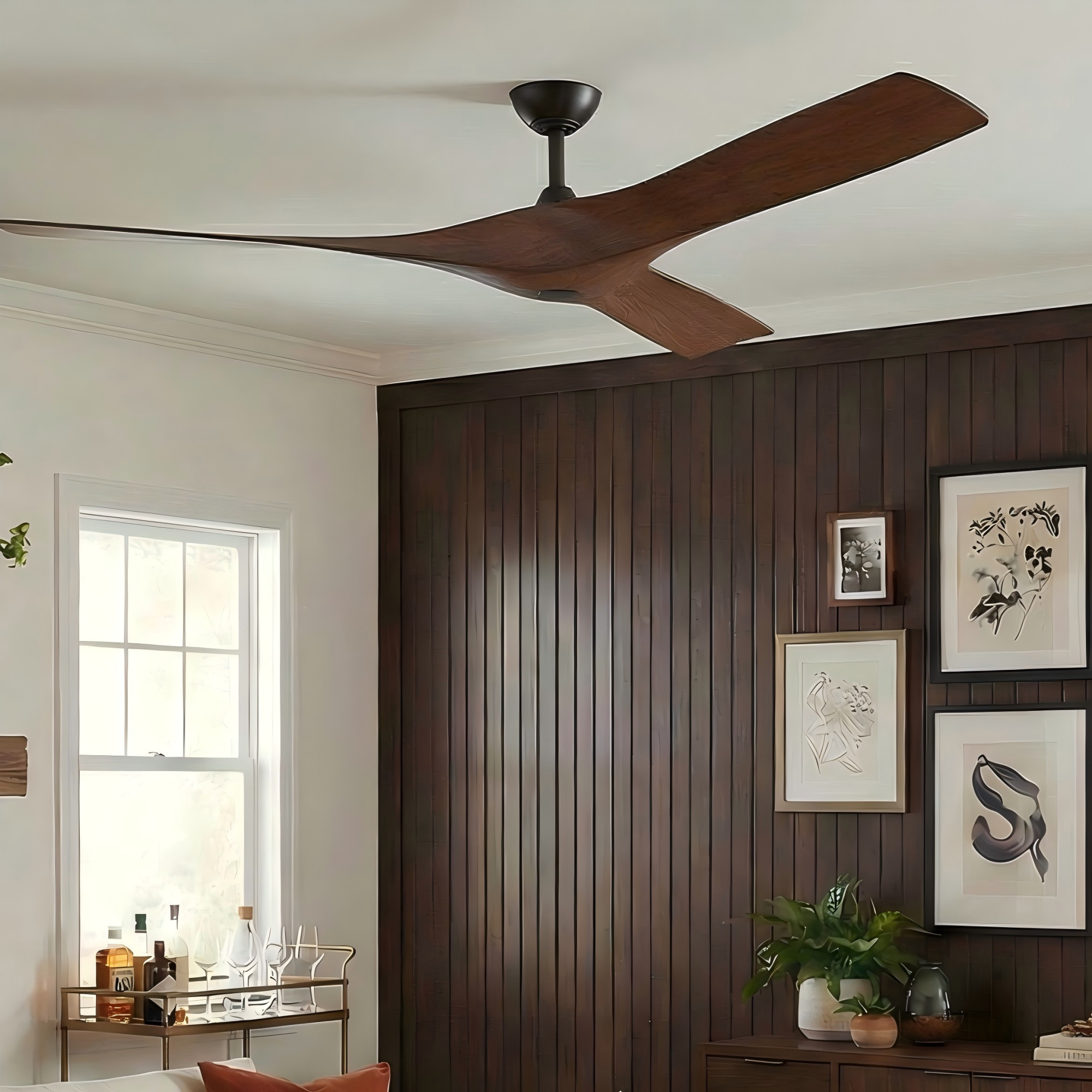 This ceiling fan features a sleek brown/black finish and comes with a 6" down rod, making it perfect for indoor use in dry environments. Its smooth, modern lines add a touch of elegance to any space. The fan is equipped with three blades and a DC motor for efficient airflow. ETL-certified for safety, it also includes a convenient remote control for easy operation.