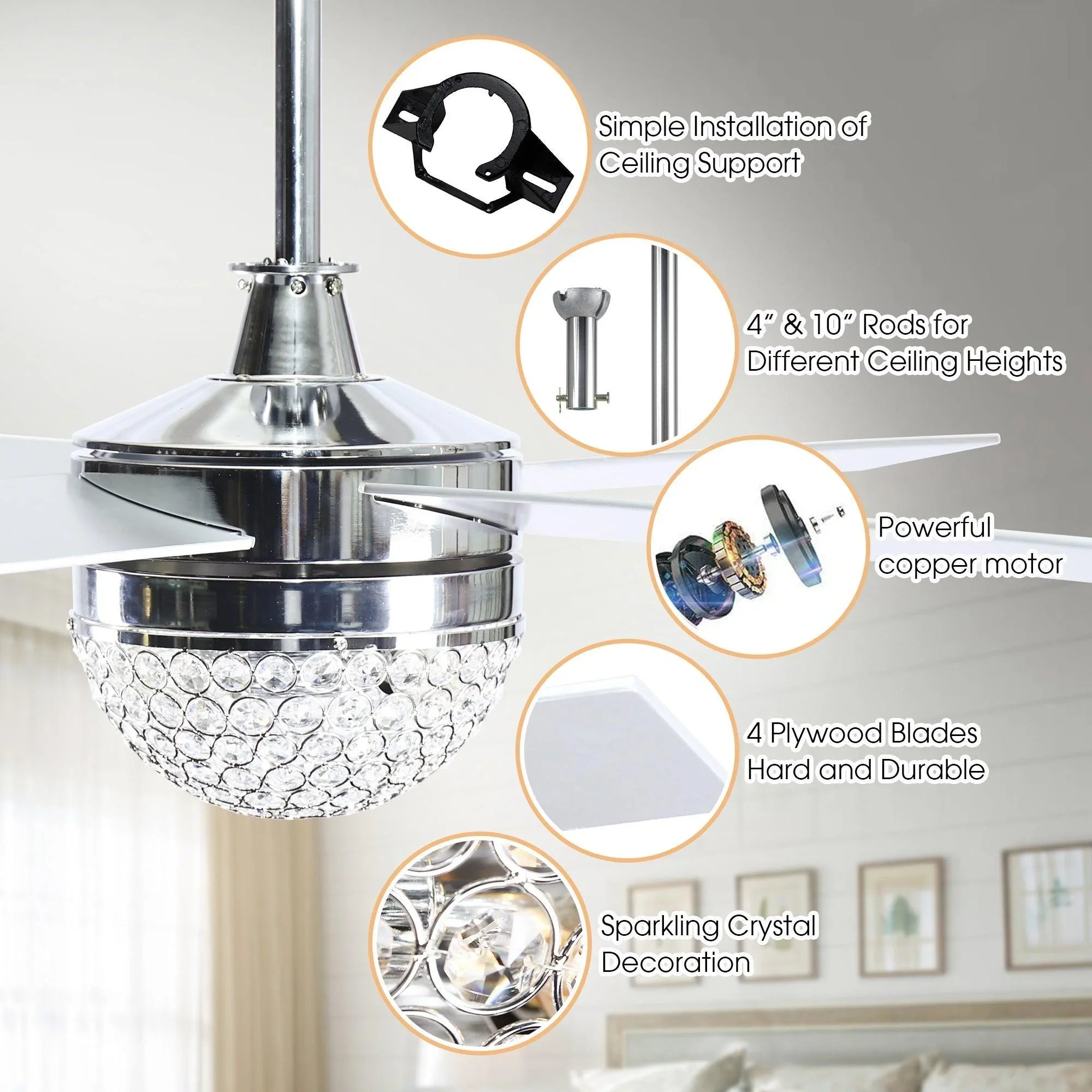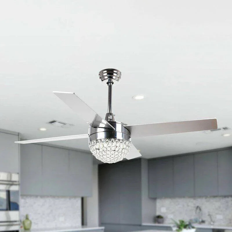 This ceiling fan and crystal chandelier combination offers the perfect blend of style and function. The four wood blades with a chrome finish give the fan a sleek, modern look. With a 3-speed handheld remote, you can easily adjust the fan speed and light settings from anywhere in the room.
